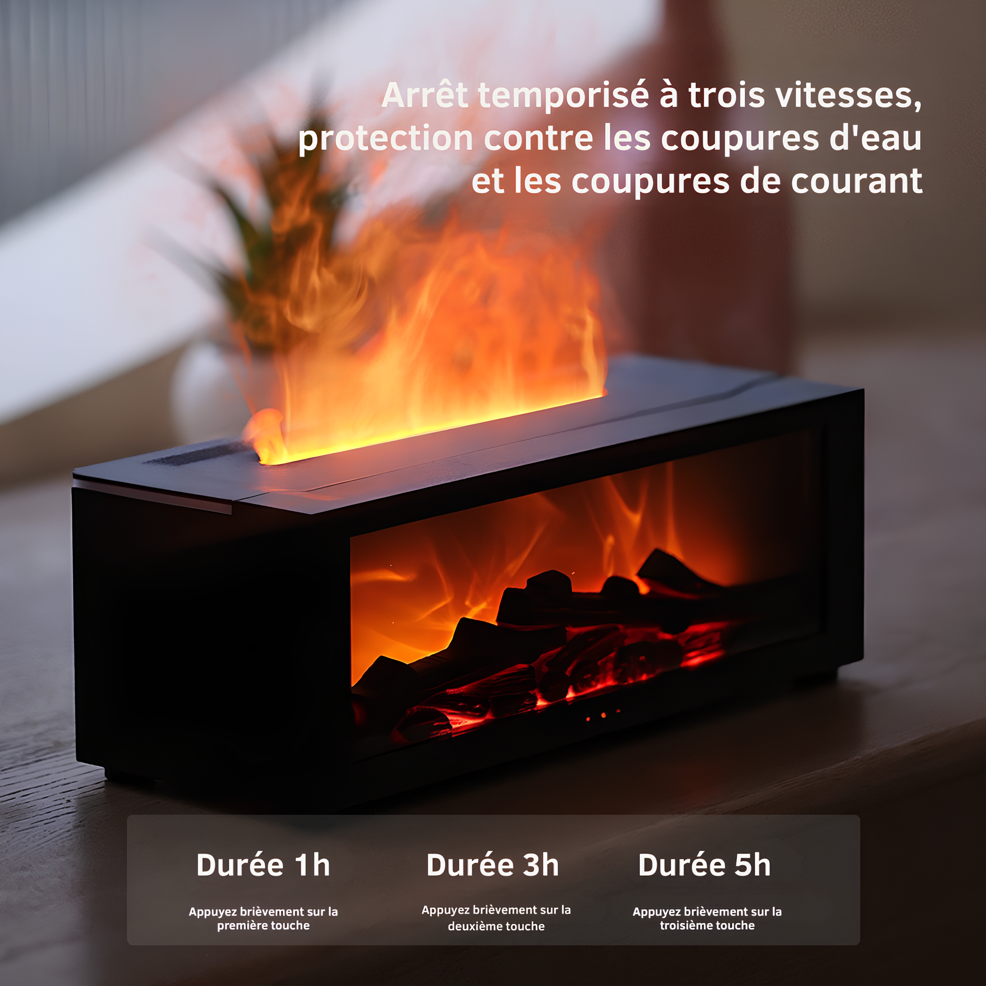 Laissez-vous hypnotiser par le FIRE MIST, le diffuseur qui recrée la magie du feu. Grâce à sa technologie combinant lumière et brume, il projette une flamme hyper-réaliste sans aucune chaleur ni danger. Un simple clic sur la télécommande suffit pour activer cette ambiance captivante, réglable sur 7 couleurs, et programmer la minuterie (6H/8H/10H) pour une sérénité sans interruption.